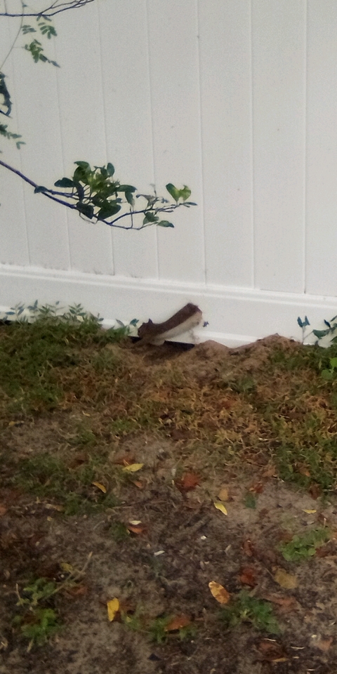 The hole was certainly not there before. The poor creature must have made it himself. Cinched halfway in our fence is a trapped squirrel.